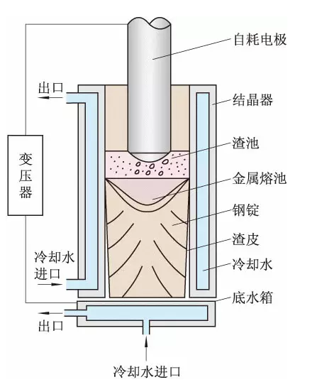 如下圖所示,通電后,電流通過(guò)液態(tài)熔渣產(chǎn)生電阻熱,自耗電極(初始熔煉鑄鍛鋼錠)在熔融渣池電阻熱的作用下熔化成液滴,鋼液在重力作用下通過(guò)渣池,在渣池下方形成淺平金屬熔池,而后在水冷結(jié)晶器的強(qiáng)制冷卻作用下逐漸凝固(金屬熔池和渣池不斷向上移動(dòng)),形成質(zhì)量?jī)?yōu)良的電渣錠。